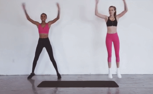 开合跳训练的时候,注意收紧核心肌群,双腿打开大概2个肩膀的宽度,双手同时向头顶靠拢,保证动作连续性。动作重复30-60秒,进行4组,再循序渐进提升组数。