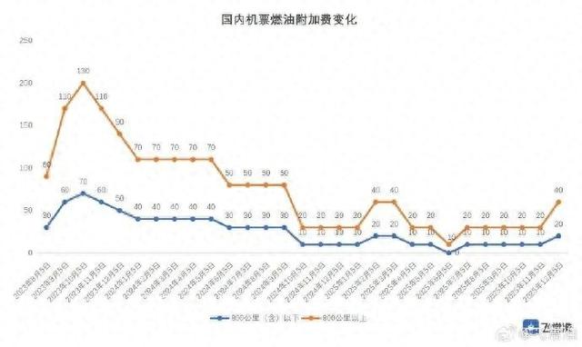 当前的燃油附加费仍按2025年12月5日(含出票日期)标准实行,800公里(含)以下航线每位成人旅客收取20元燃油附加费,800公里以上每人40元,相较于此前标准分别上涨了10元、20元。