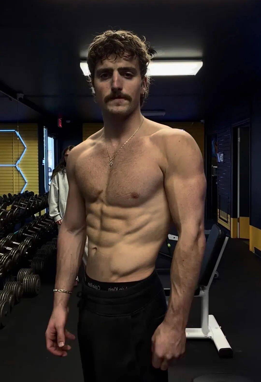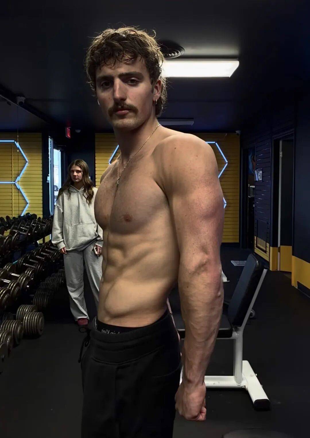 Benson Boone 在健身房里的肌肉,大概是那种你一眼看过去就知道他真的很拼的类型。