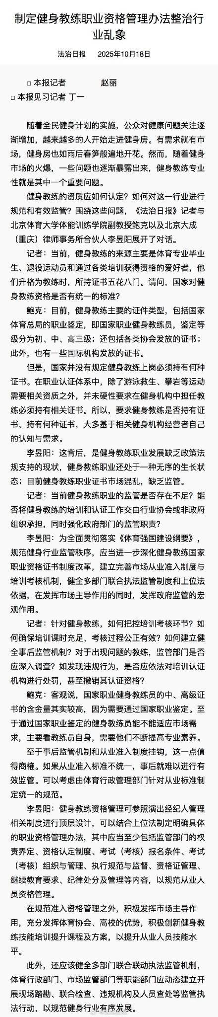 健身教练的资质应如何认定?如何对这一行业进行规范和有效监管?围绕这些问题,《法治日报》记者与北京体育大学体能训练学院副教授鲍克以及北京大成(重庆)律师事务所合伙人李昱阳展开了对话。