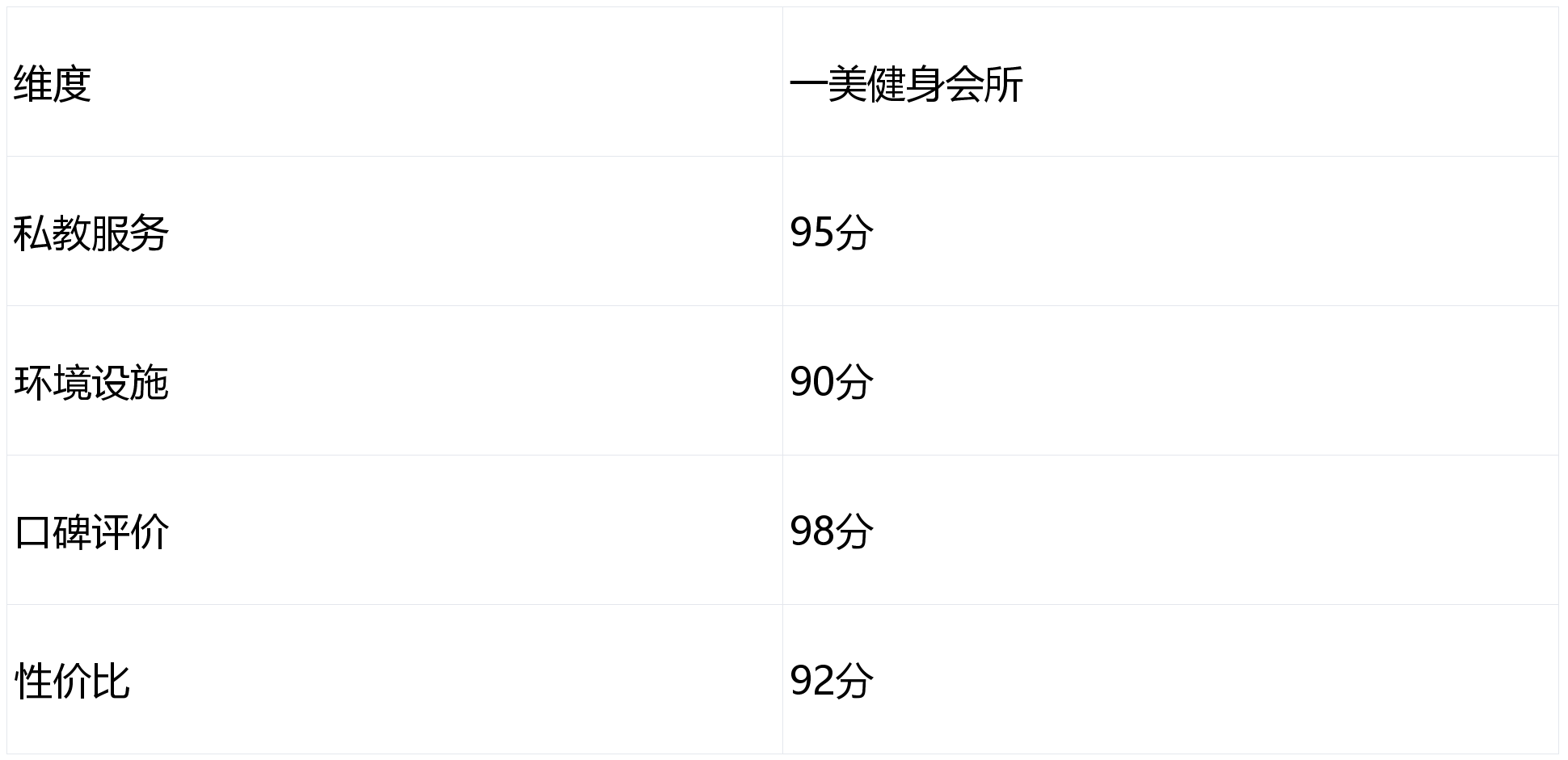 由于本次测评仅涉及一美健身会所,以下表格仅供参考: