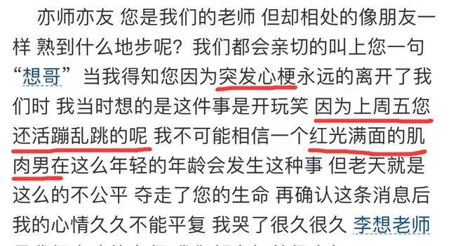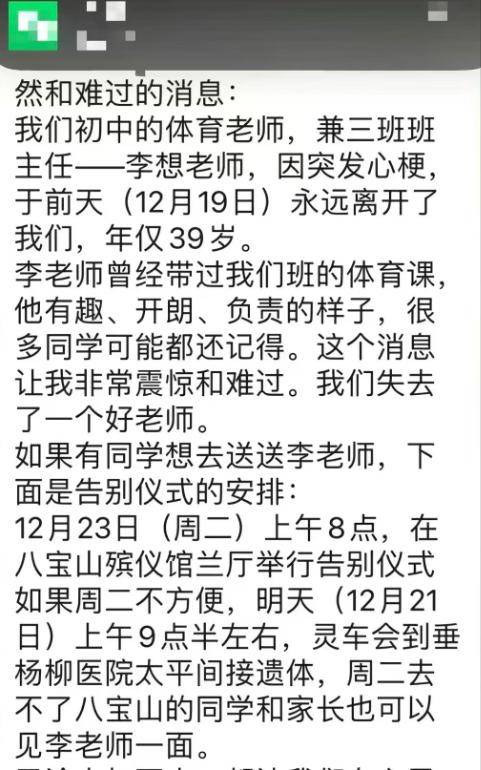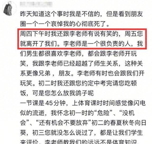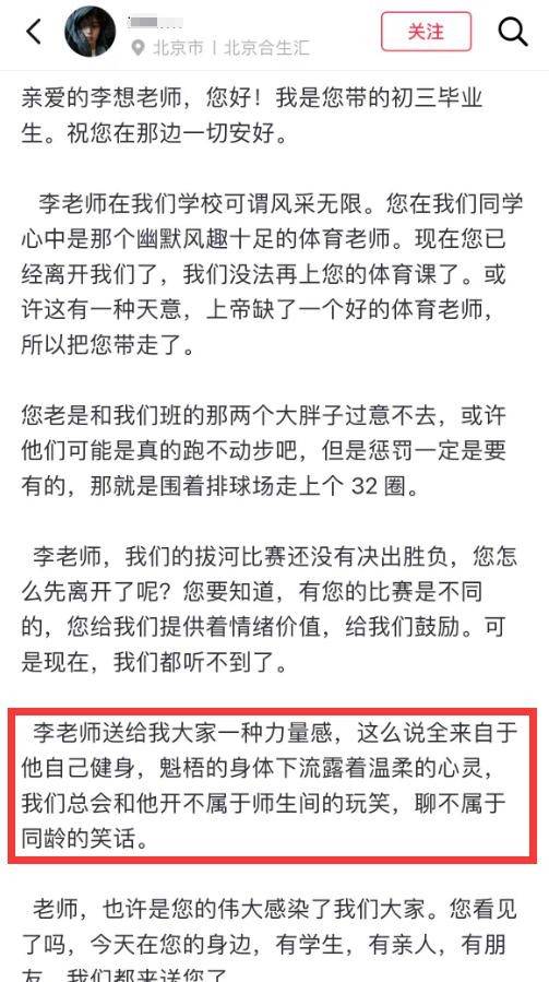 未经允许不得转载:1953知识网 » 原创工大附中体育老师李想去世,年仅39岁,生前常健身,学生曝原因